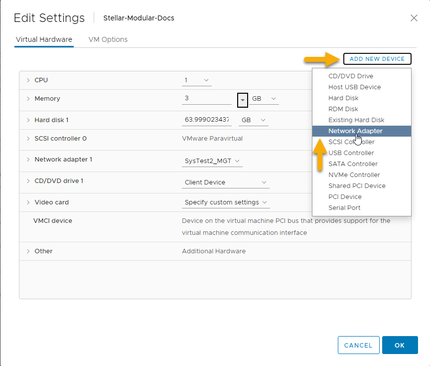 Click the Add New Device button and select Network Adapter from the context menu that appears.