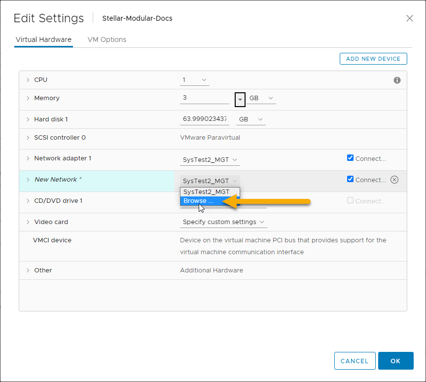 Click the dropdown for the new adapter's network and select the Browse option.