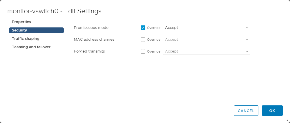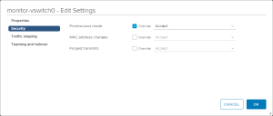 Click on the Security entry in the left navigation panel and enable Promiscuous Mode by checking the corresponding Override and Accept boxes, as shown in the image below. Then, click OK to apply your settings.
