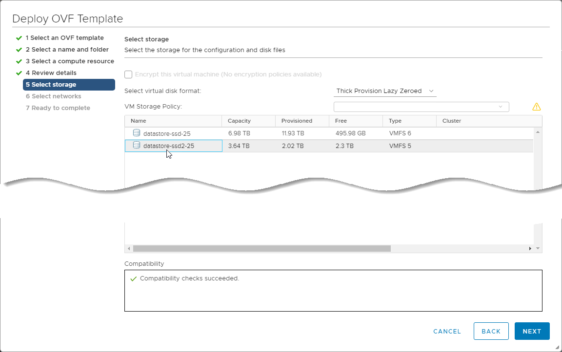 In the Select storage step, select the datastore to be used for the VM's configuration and disk files and click Next to continue.