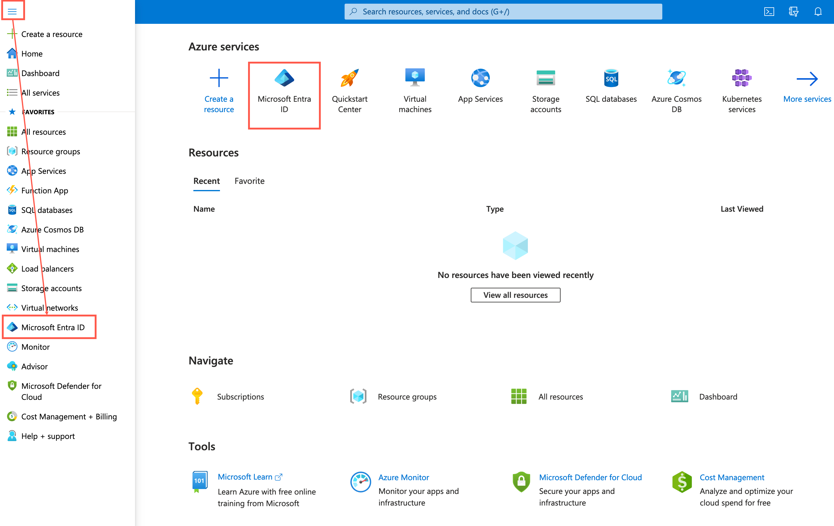 1. Log in to https://portal.azure.com as an administrative user and select Microsoft Entra IDfrom the navigation pane or from Azure services.