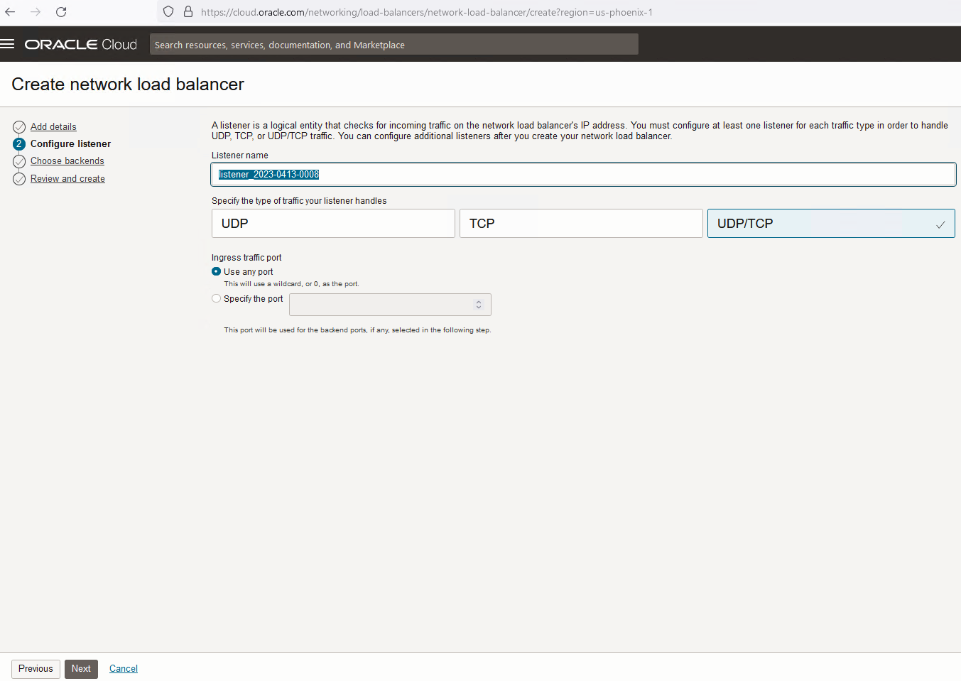Click Next and configure a logical listener for the load balancer. Set the traffic type to UDP/TCP and leave Ingress traffic port set to Use any port. For example: