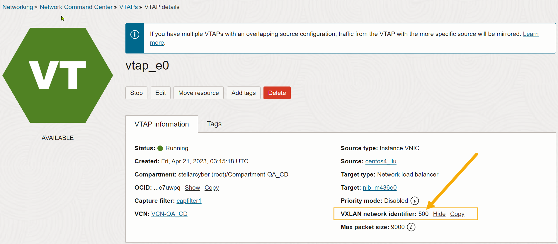 Set VNI to the VXLAN ID for your VTAP in OCI. You can find this in the VTAP details screen for your VTAP. For example: