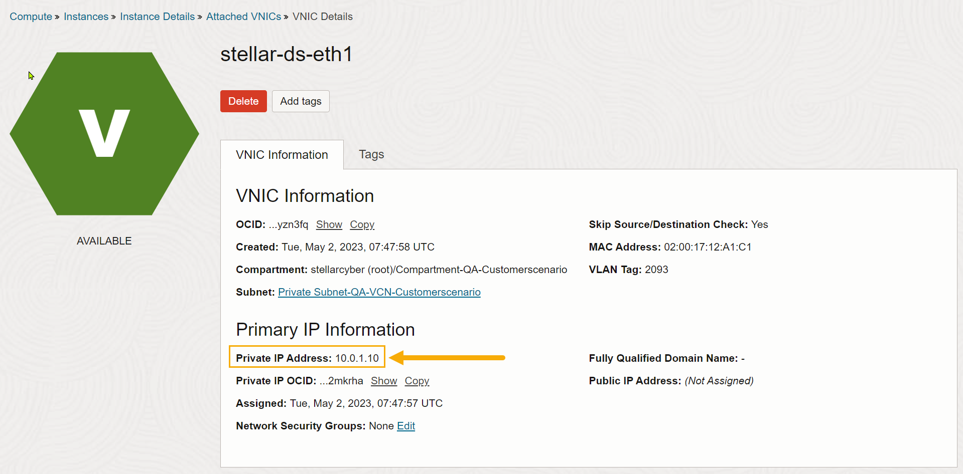 Locate and record the second VNIC's private IP address. You'll need this when you add the sensor to the DP and set up the VTAP to direct traffic to it. For example: