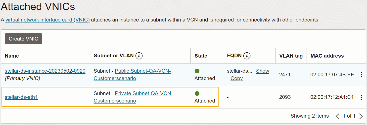 The Attached VNICs table updates to show the newly attached monitoring interface: