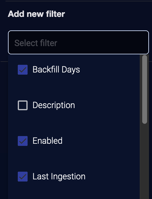 If a defined filter is unselected, you can click the search box under Add new filter to select a filter from the dropdown.