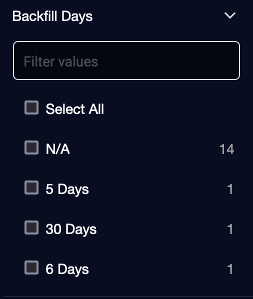 For Backfill Days, select a number of days using the check boxes or Select All. The number of feeds with each number of backfill days is displayed on the right.