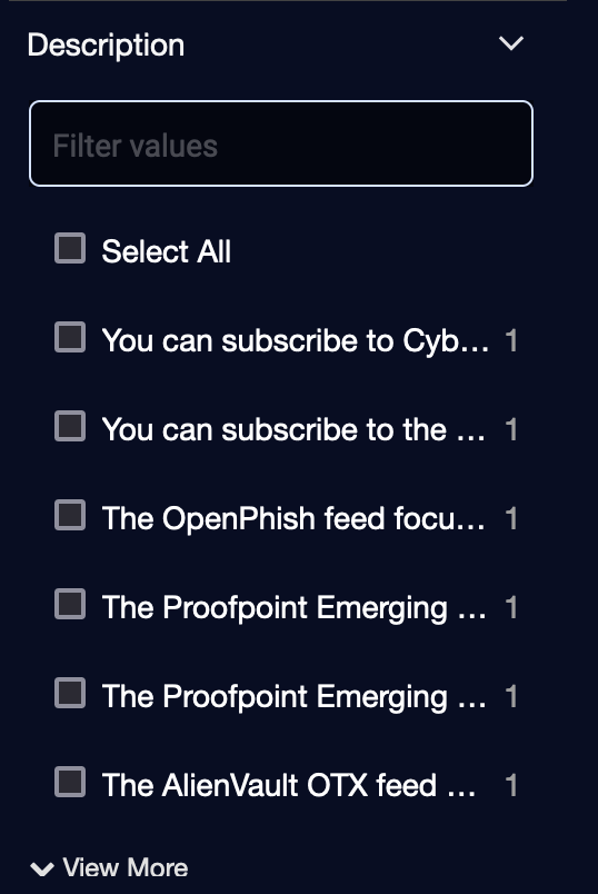 For Description, select the description of a feed using the check boxes or Select All. The number of feeds with each description is displayed on the right.