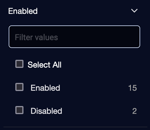 For Enabled, select a state, either Enabled or Disabled, using the check boxes or Select All. The number of feeds with each state is displayed on the right.