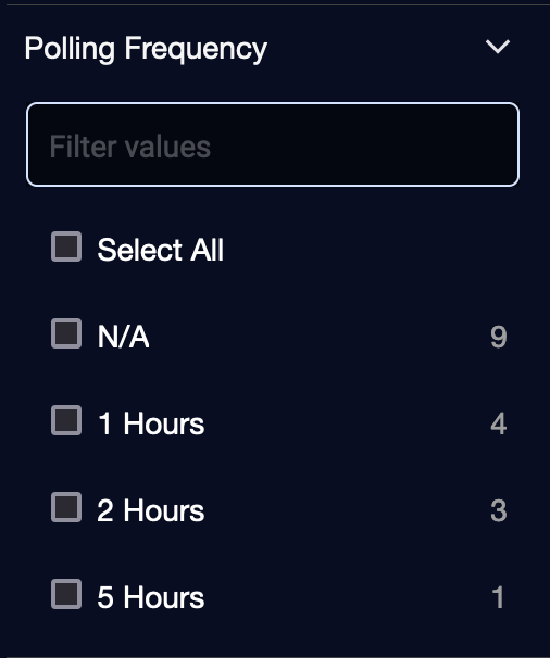 For Polling Frequency, select a frequency using the check boxes or Select All. The number of feeds with each frequency is displayed on the right.