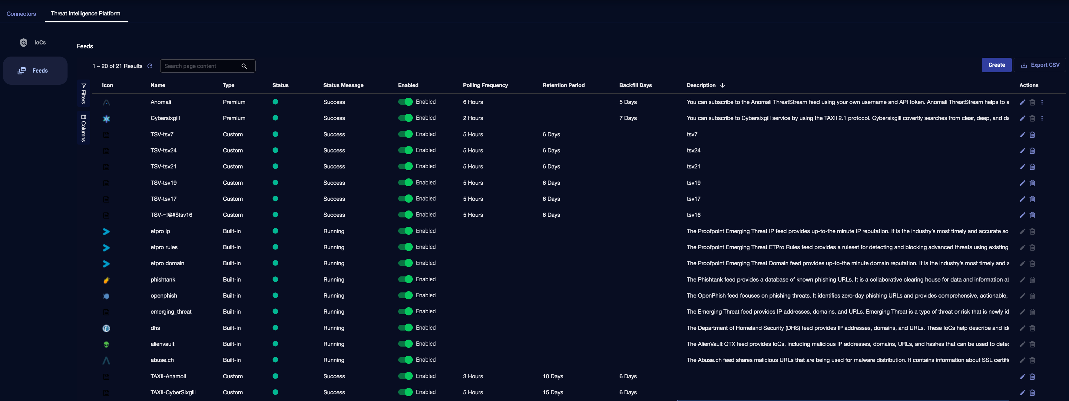 Custom feeds (TAXII and TSV) are added using the Create button and then providing a collection URL and authentication credentials (see Adding Custom Feeds)