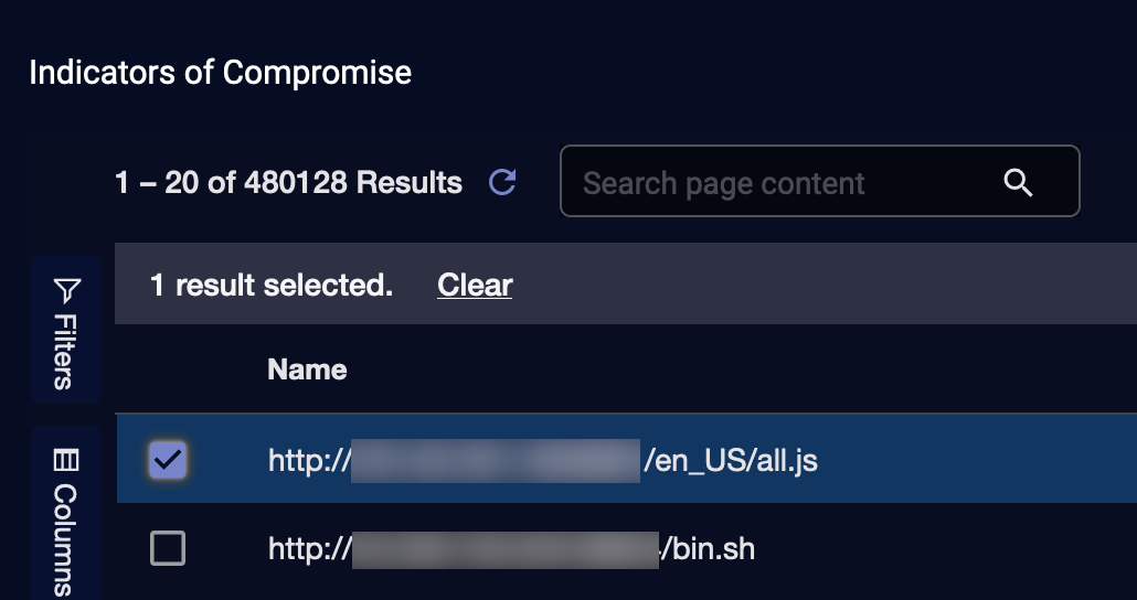 You can export Selected Columns or All Columns to a maximum of 10,000 IoCs. If there are more than 10,000, use filters and sort to select the 10,000 you want to export.