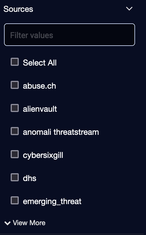 Sources—sources of the IoC, such as etpro, alienvault, or emerging_threat (an IoC could be ingested from multiple sources)