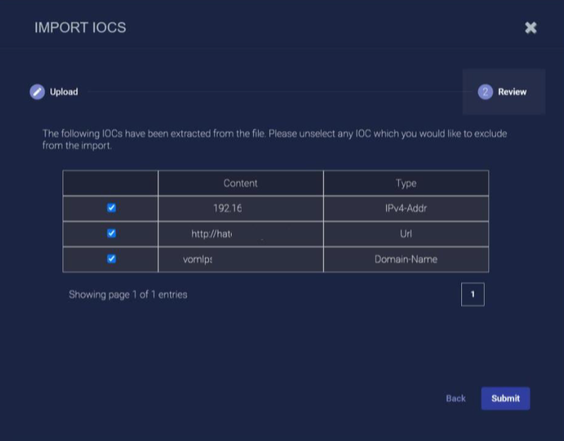 The IoCs extracted from the file are displayed. Unselect any IoCs you would like to exclude from the import.