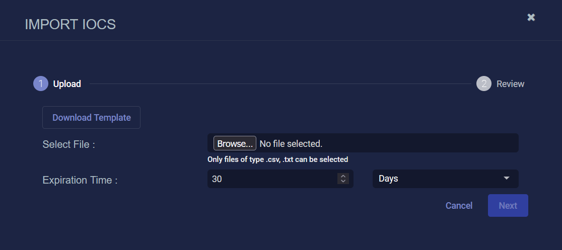 You can import new IoCs from a file. The supported IoC types are domain, IP address, and URL.