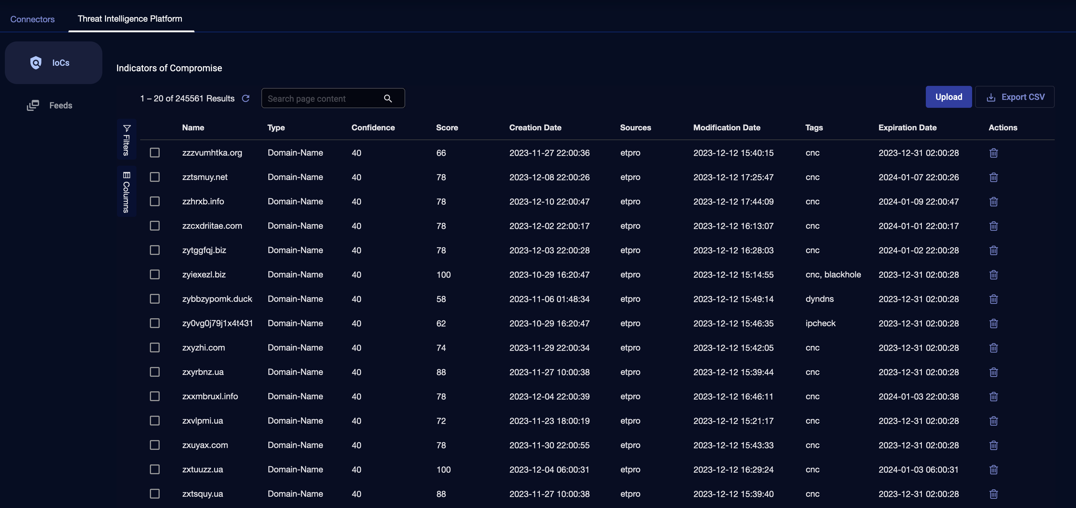 The IoCs tab displays all the latest IoCs that are present in storage, along with data associated with each IoC, such as expiration date, source, and confidence score.