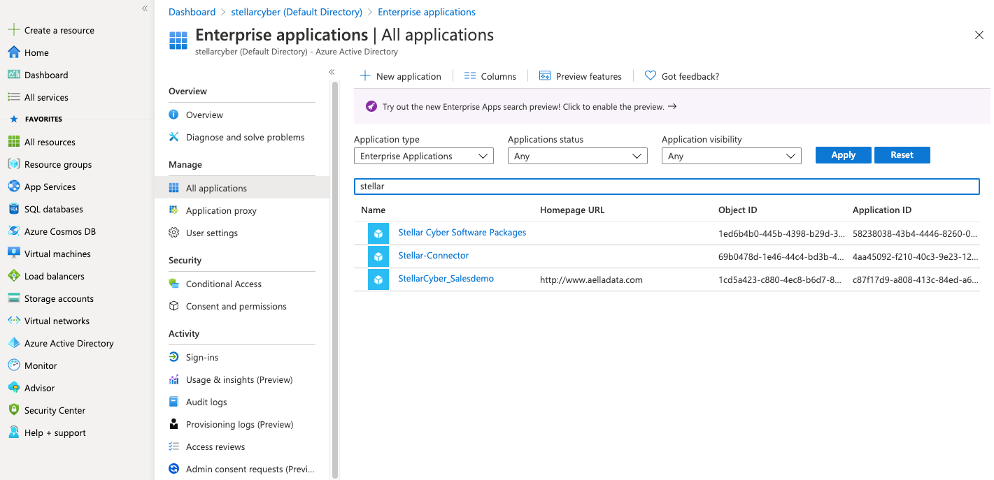 Search for Stellar. The Stellar Cyber applications that you authorized appear.