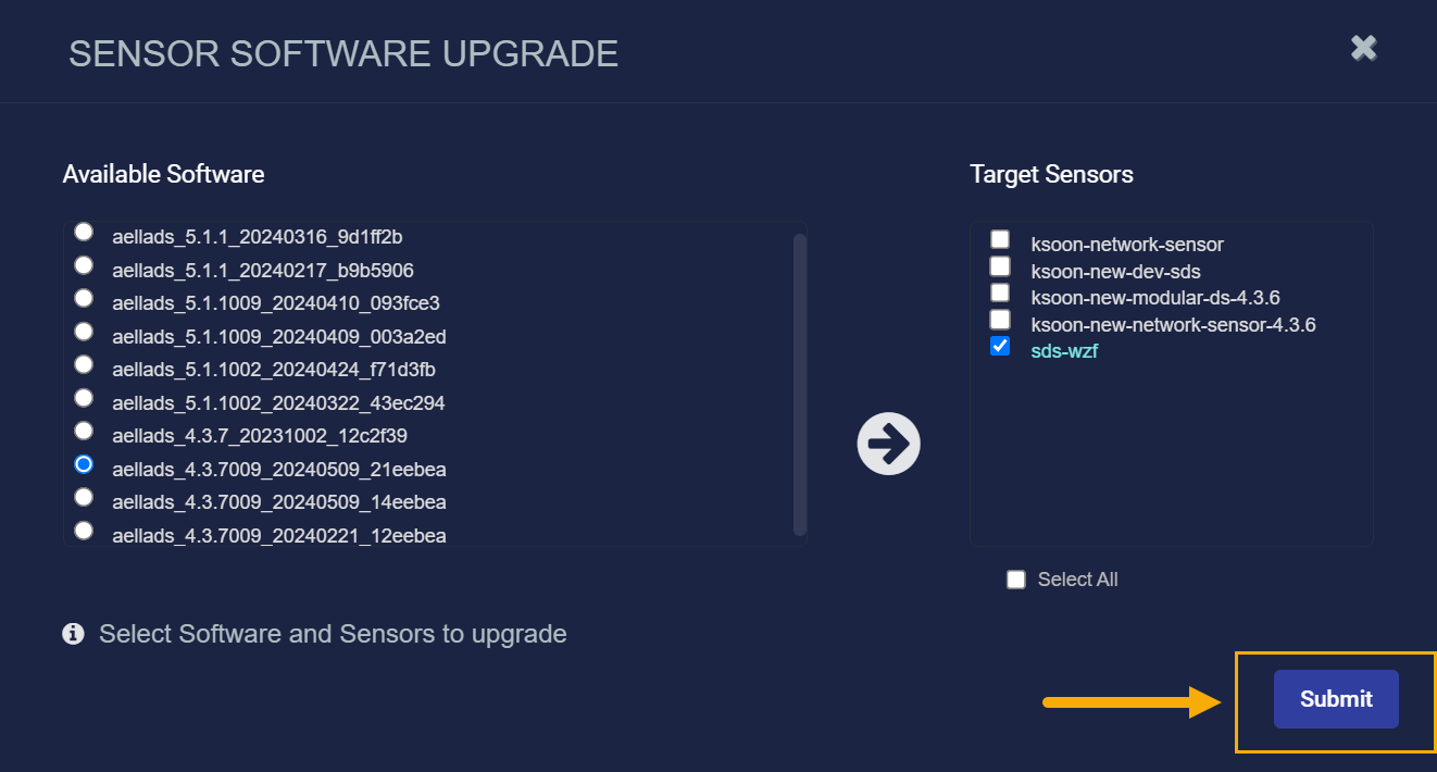 Once you have selected the target sensor(s), click Submit to begin the upgrade.