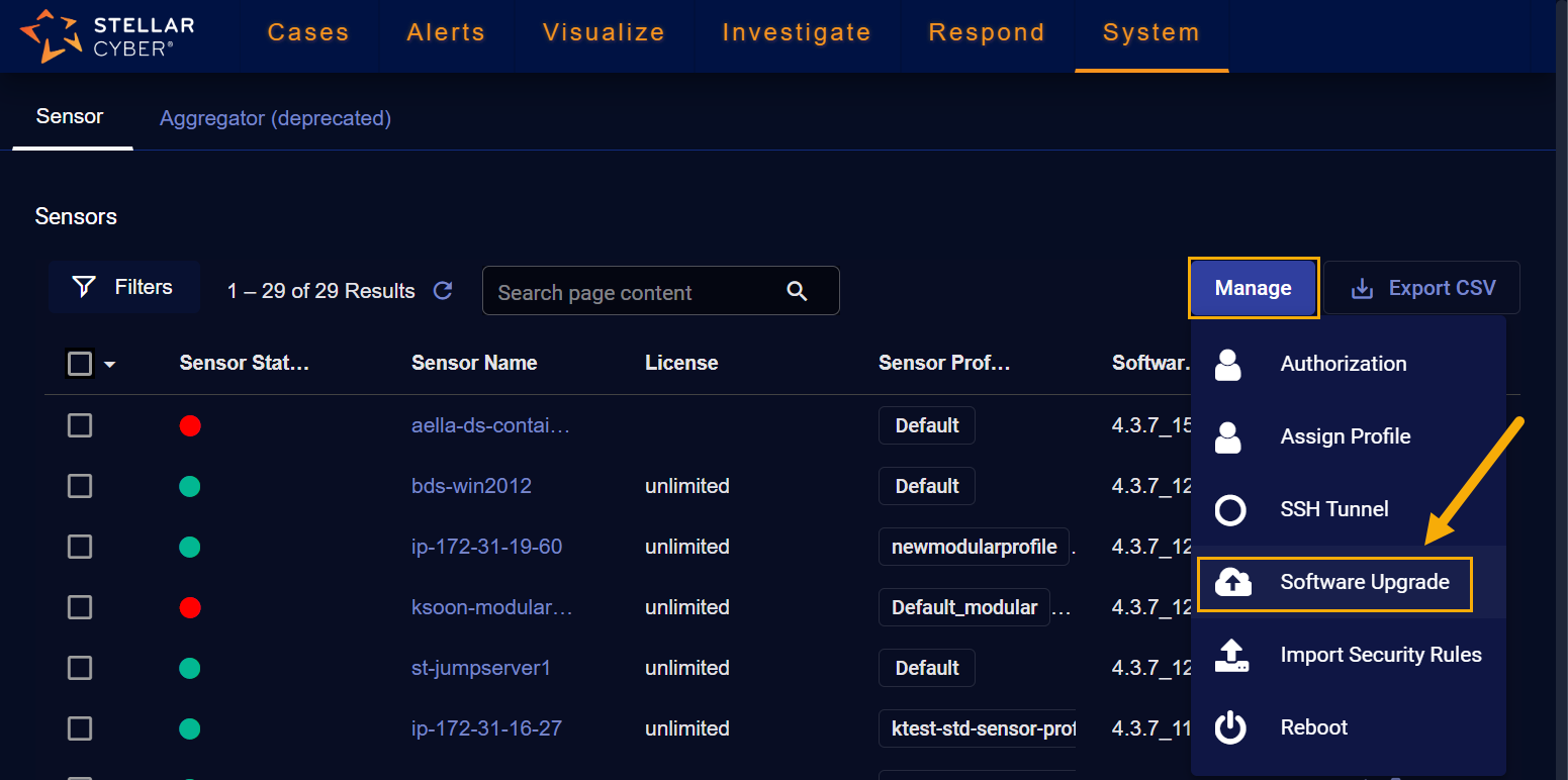 Navigate to the System | Sensors page and select the Manage | Software Upgrade option, as illustrated in the figure below: