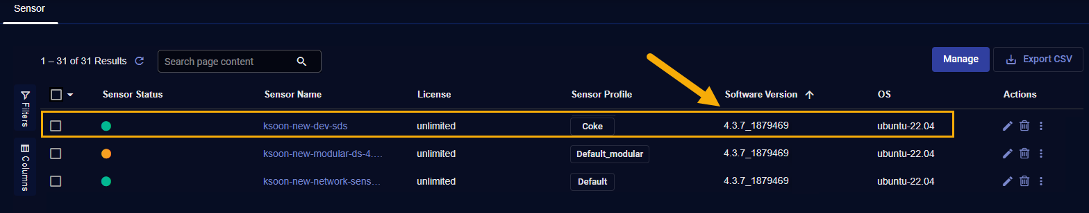 You can see both the Stellar Cyber software version for your sensors and the platform OS version in the System | Sensors page. Make sure both the Software Version and OS columns are displayed. For example: