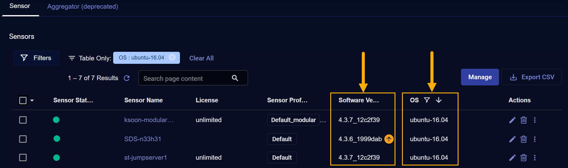 4.3.7009 does not support upgrades of legacy, purpose-built aggregators listed in the Aggregator (deprecated) tab of the System | Sensors page. Attempts to upgrade legacy, purpose-built aggregators are rejected by the aggregator.