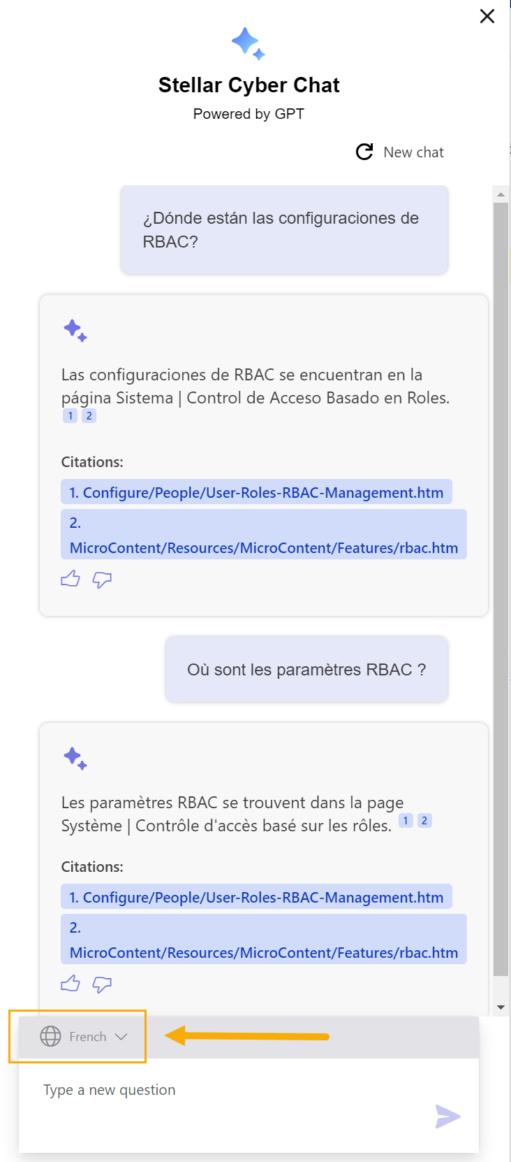 You can use the language dropdown at the bottom of the Stellar Cyber Chat window to change the language Stellar Cyber Chat uses to answer questions, as illustrated below.