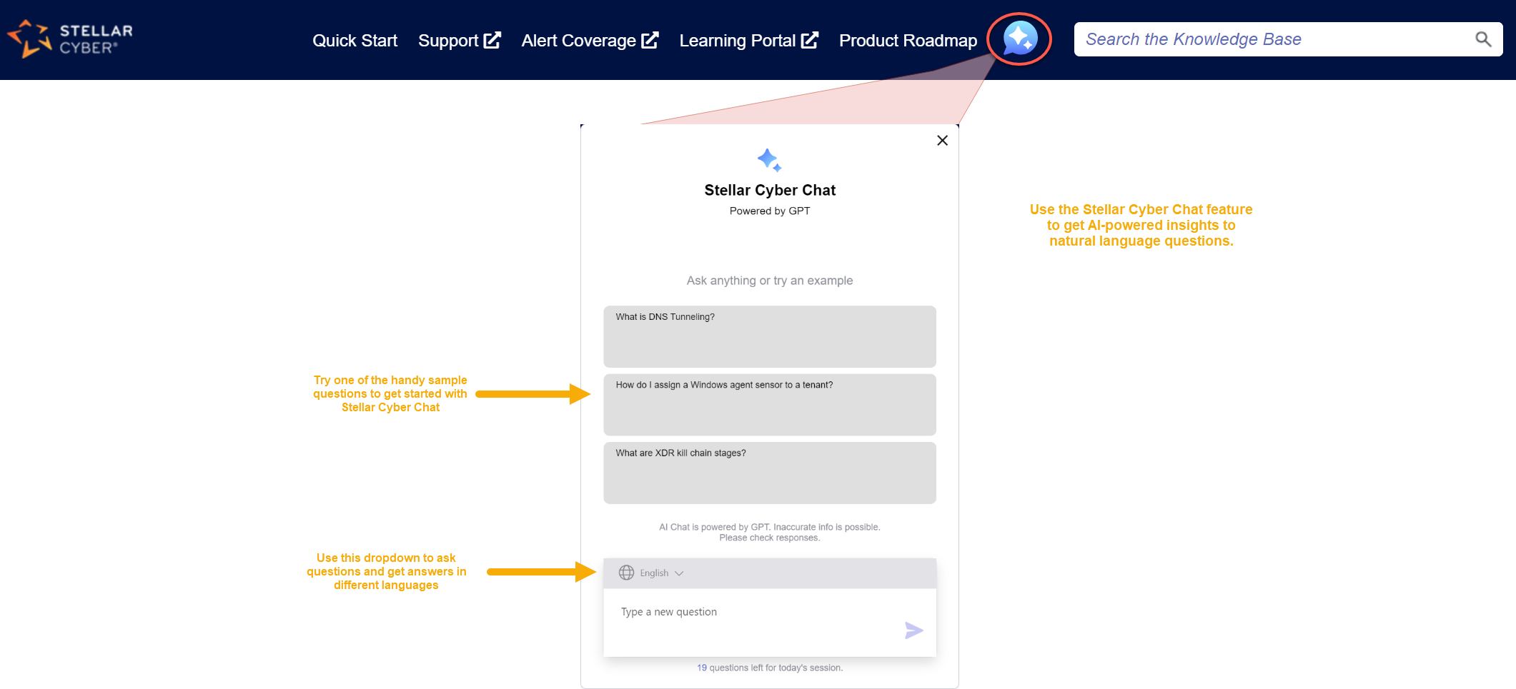 The Knowledge Base includes a Stellar Cyber Chat feature that lets you ask natural language questions and receive results powered by GPT artificial intelligence. You can access Stellar Cyber Chat by clicking its icon in the Knowledge Base's top menu
