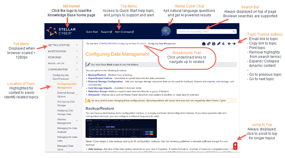 The Stellar Cyber Knowledge Base is a comprehensive source for learning about Stellar Cyber architecture, installing the product components, configuring, maintaining them, and using the product.