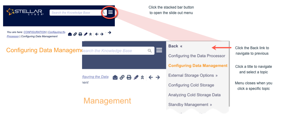 For narrowly scaled browsers (below 1280px), the full menu is hidden and instead a dynamic Slide out menu with the same content is available. Access this menu by clicking the stacked bar button to the right of the search field. Navigate by selecting chapters and topics and clicking the Back link to reverse your navigation steps. The menu hides automatically when you select a topic.