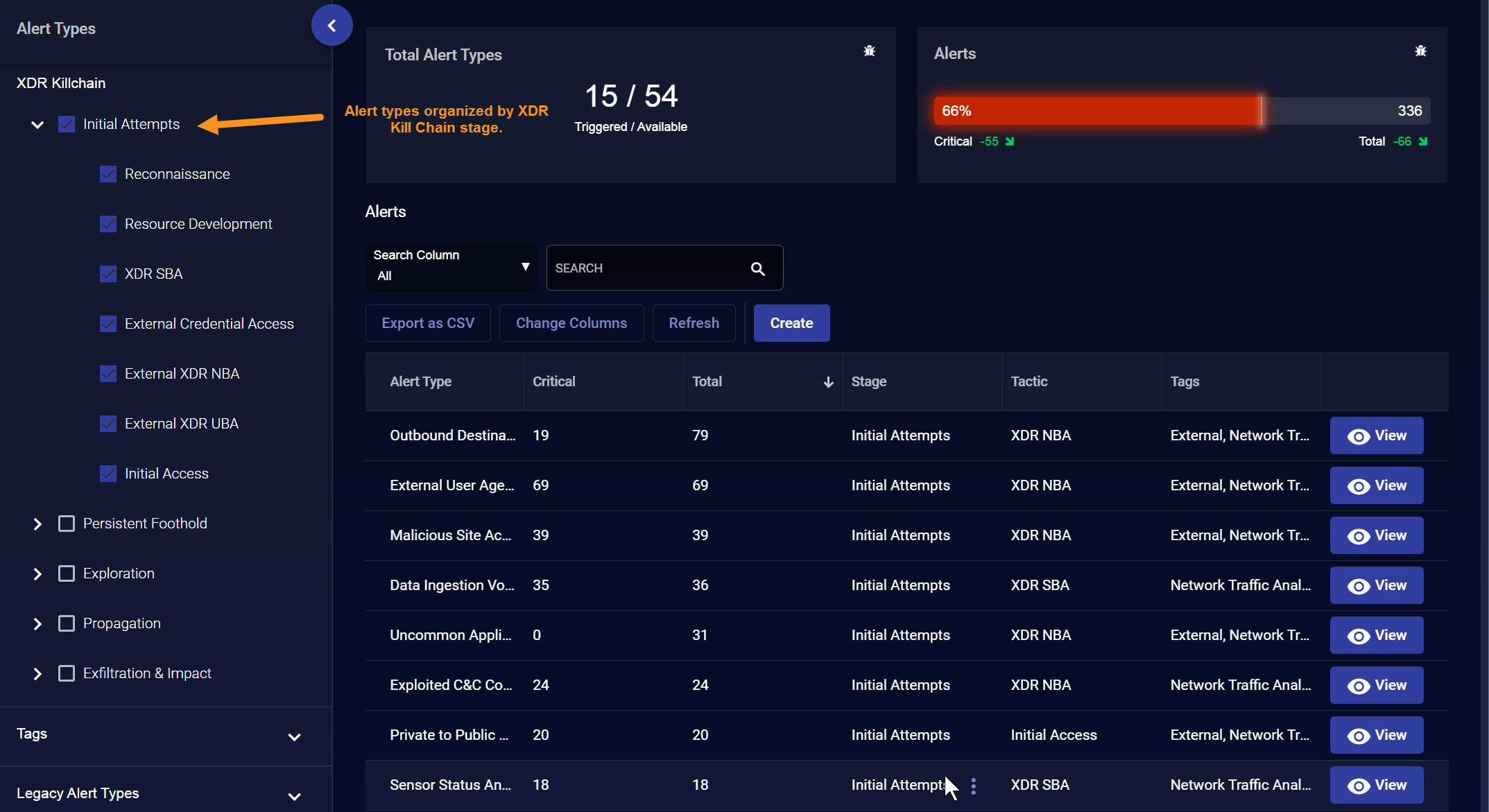 There are many different types of alerts available in Stellar Cyber, organized by XDR Kill Chain Stage, Tactic, and Technique, with each focused on a specific type of security threat. The figure above shows the organization of the alerts in the Alert Types page.