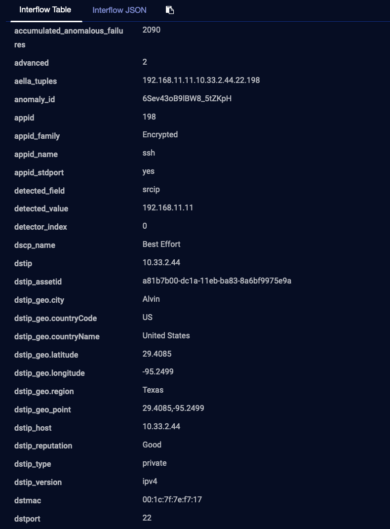 Although the names of the keys are largely intuitive for security analysts, a dictionary of the Interflow keys can be found on its own Interflow page. The Interflow Dictionary function on the Threat Hunting screen also provides a list of Interflow keys to choose from when searching for threats in the Data Lake. The list of keys will evolve with new versions of Stellar Cyber.