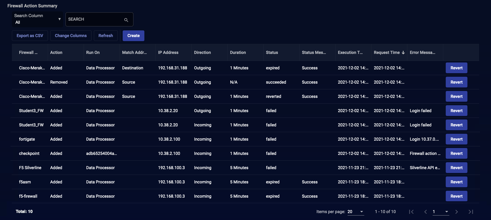 Depending on the originating connector, you may be able to revert a host containment from Stellar Cyber. If this is supported, a Revert button is displayed in the row for the containment action of the Respond | Actions | Endpoint Actions table. For supported connectors, using Revert triggers a Lift Containment action that is displayed in the same table. If the API for the managing service does not support a revert option then you need to use that product's UI to manage the host state.