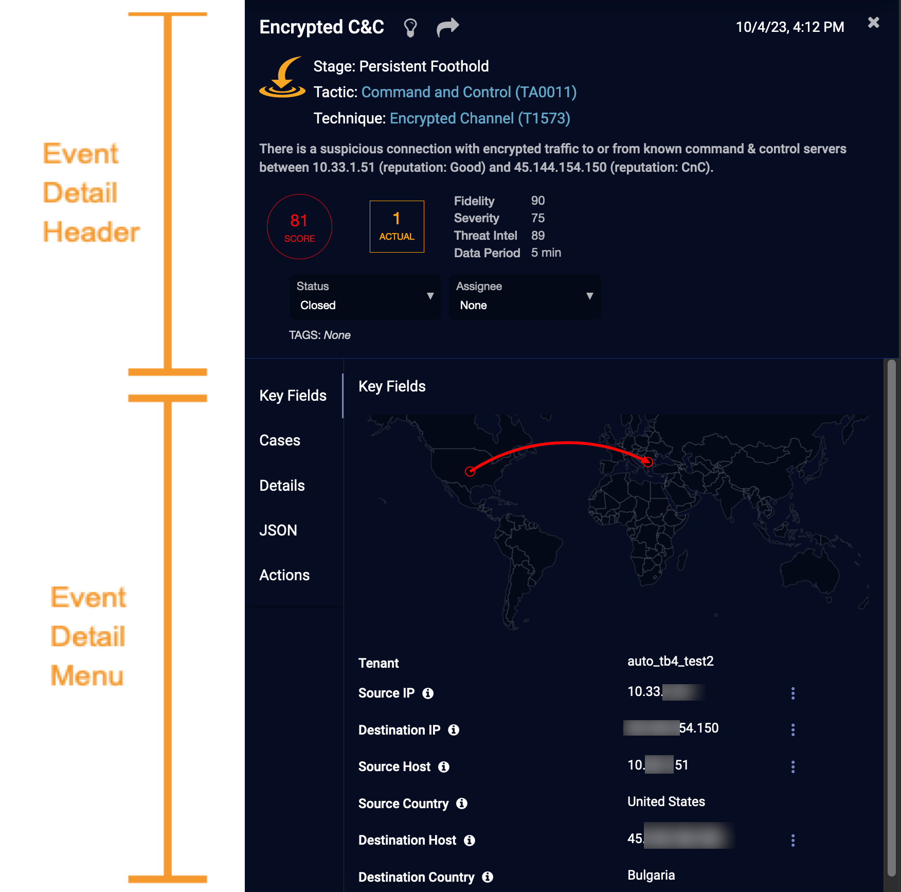 One of the most fundamental and useful tools in Stellar Cyber is the Event Details panel which provides analysis on the event, options to perform assorted actions, and access to the Interflow record. This panel can be accessed anywhere a table of events is found. You can access these event tables from assorted locations as follows: