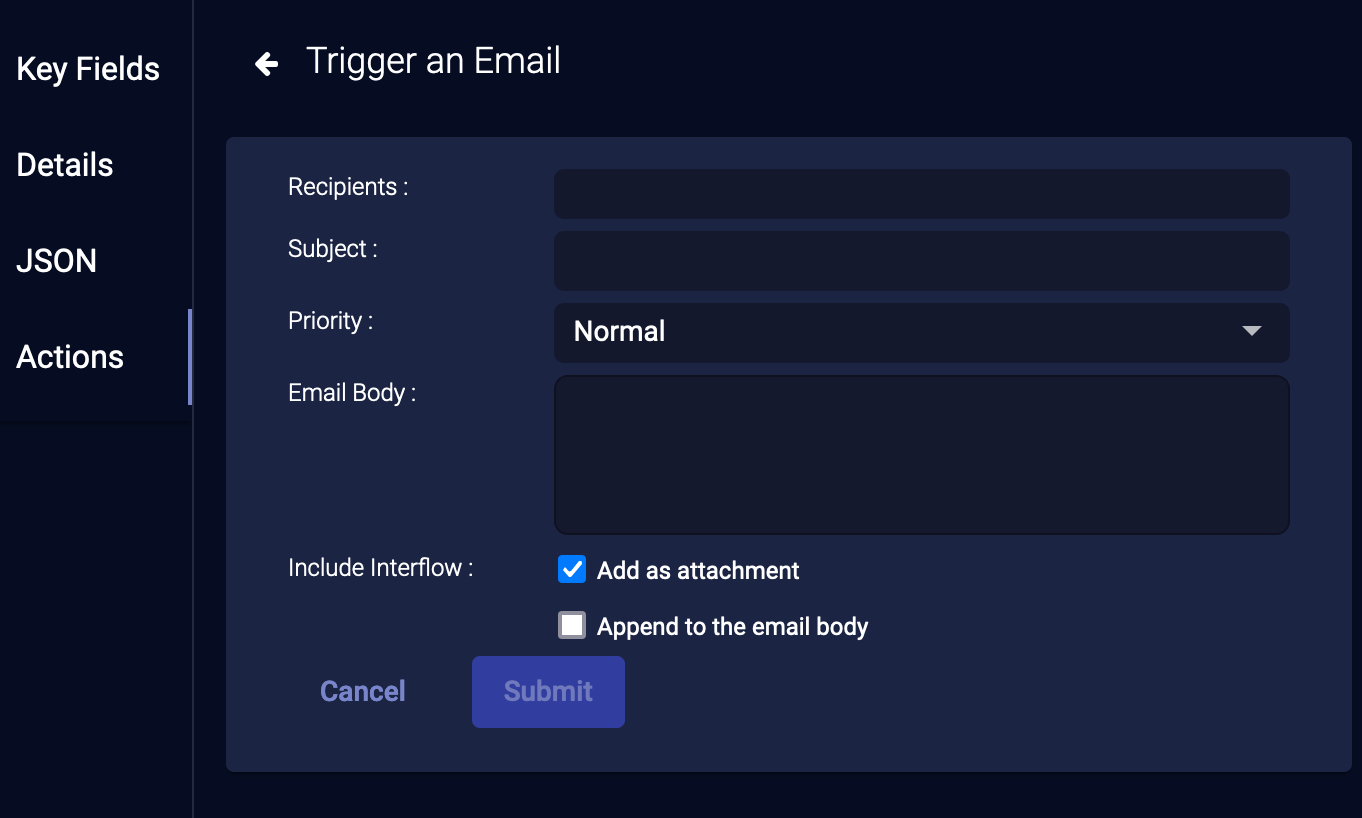 { "connect_actionapi_vlan_assign":true, "connect_actionapi_vlan_assign_id":"vlan233" }Do not include the IP or MAC address, as that is added automatically based on your selection in the previous step. The JSON that is transmitted to Forescout will include the IP or MAC and the property tag, similar to the sample below.