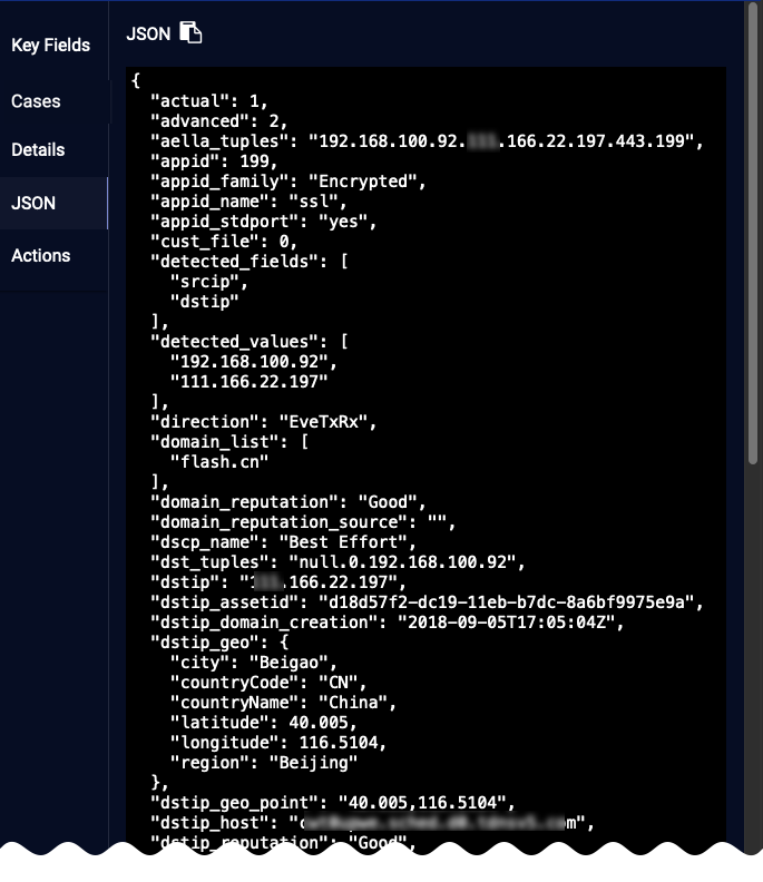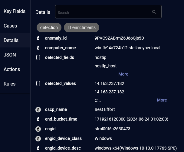 Stellar Cyber provides several options to help you more quickly find the information you're looking for in the Details section: quick filters and a search field.