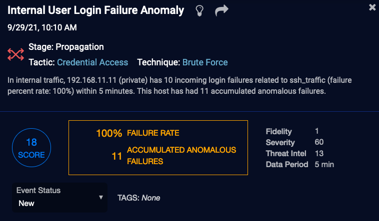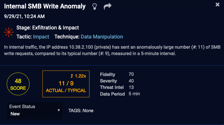 Machine Learning – This orange rectangular block is displayed for events other than raw data or straightforward traffic events. Alert types handled by Stellar Cyber Machine Learning may include this block to highlight key triggers, such as actual versus typical, that contributed to the alert scoring. Note the difference in key triggers illustrated in the example images above.