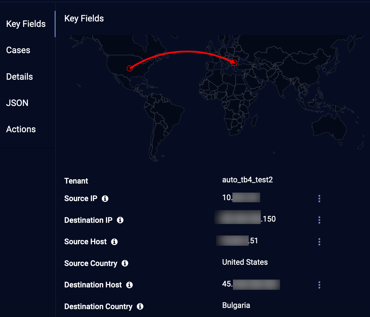 The Key Fields includes a global map on which the geolocation of the source and destination IP addresses are plotted with a connecting arc. For applicable alerts such as User Login Location Anomaly, the map includes data points for the closest typical login locations of that user.