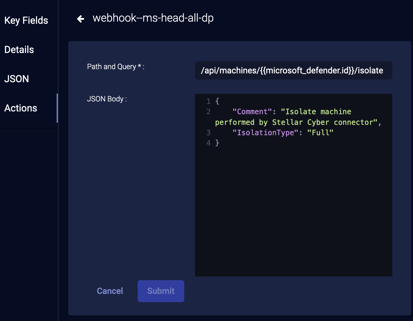 If your connector was created with default JSON, you can customize it now, or skip this step. Populate the JSON field with the action you want the connector to transmit to the Forescout app configured in the beginning of this procedure. Note that Stellar Cyber verifies general format of the JSON, not the logic. Following is an example based on ActionAPI's supported JSON properties: