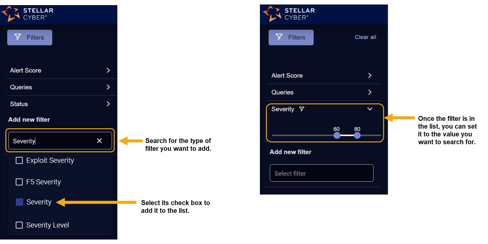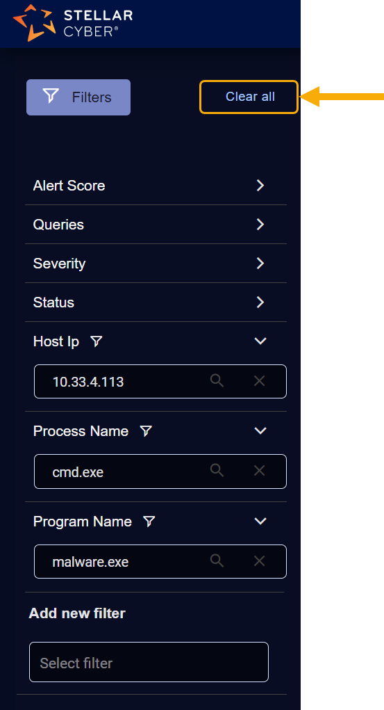 Search for any term that appears in a field key, name, or value and use commas to separate multiple terms. Stellar Cyber displays all results that match any of the search terms you enter. If you're applying a filter at the time of a search, then Stellar Cyber limits its search to just the filtered data. If no filter is applied, then it searches through all unfiltered data.