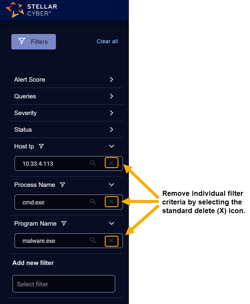 You can remove individual filter criteria from the current search by clicking their standard delete (X) icons in the filter panel. For example: