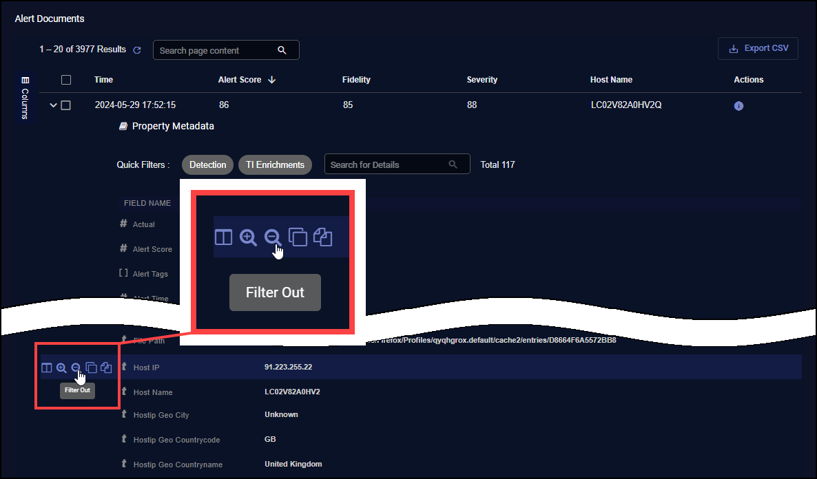 You can apply quick filters to control which Interflow key-pairs are displayed and perform searches. You can apply quick filters to display only detections, only TI (Threat Intelligence) enrichments, or both. When you don't apply a filter, you see all the key-value pairs for an alert.
