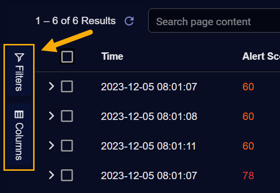 Use the Columns button to toggle the Column Selector panel open and closed. The Column Selector panel lets you choose which columns to include in the table. Most Stellar Cyber tables include this button.