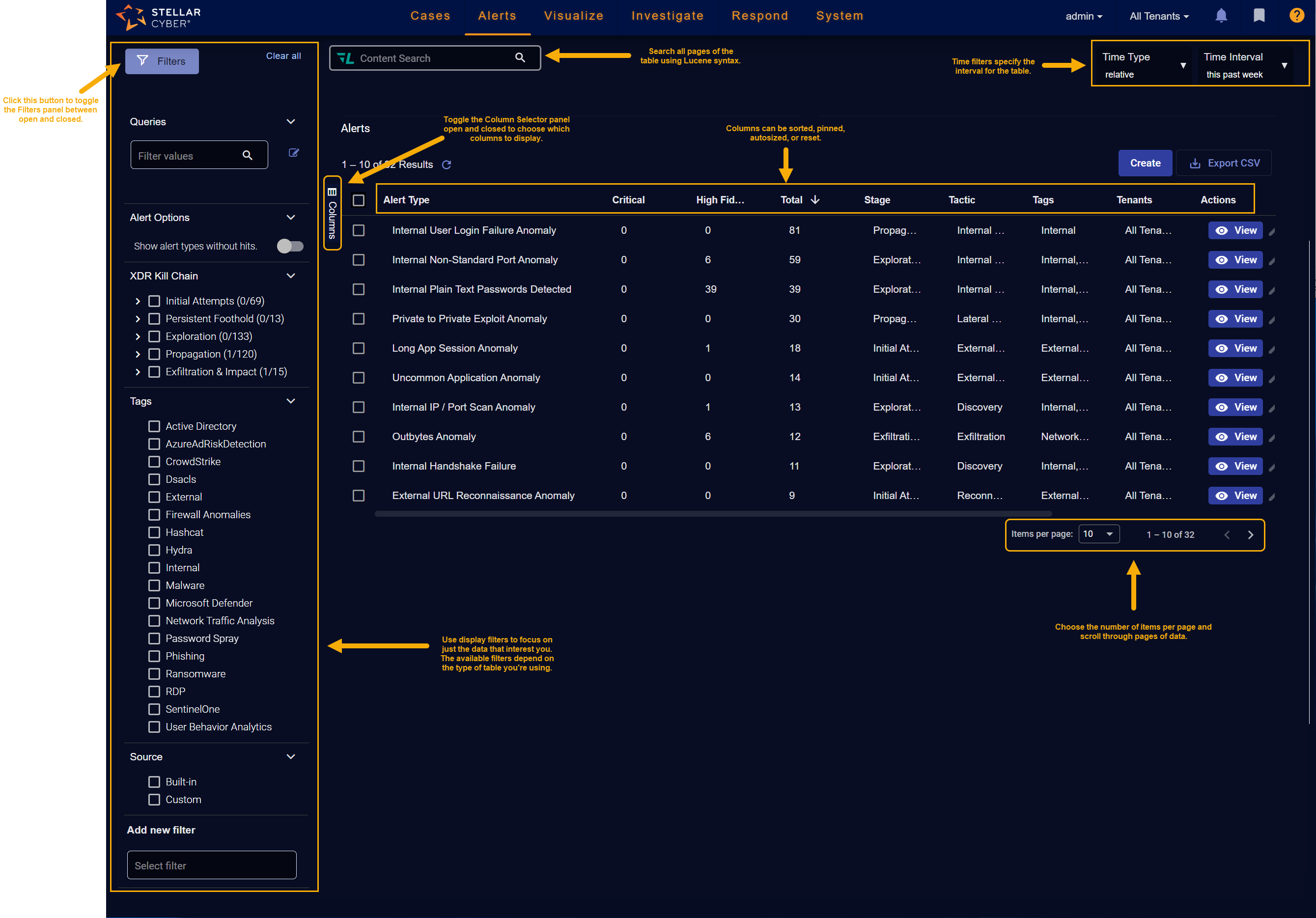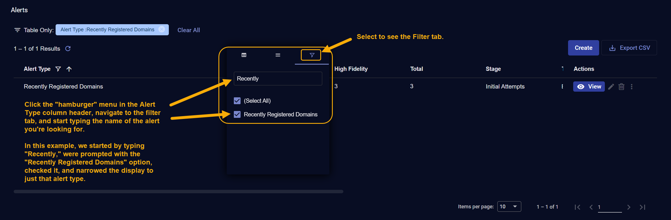You can search the Alerts table for all alerts of a specific type using either the global search bar or a table filter in the Alert Type column: