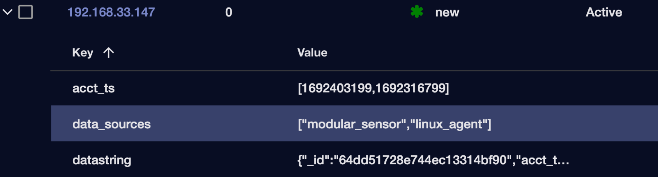When using table data as a filter, be aware of whether the data includes multiple values. For example, the figure below shows values of both modular_sensor and Linux_agent for the data_sources Interflow key. Rather than using the Filter For button to add this entire term as a search filter, try manually supplying one or the other in the Filters panel at the left of the display.