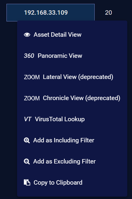 Depending on the type of data displayed, you may have access to more complex options for drilling elsewhere in Stellar Cyber, as described in Performing Field Actions and illustrated below.