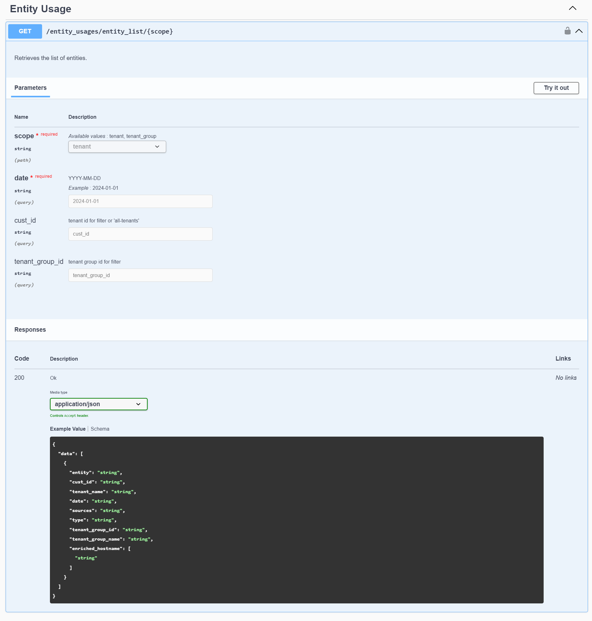 You can also work with the Entity Usage endpoint in the reference material from the API's swagger.json file, as illustrated below: