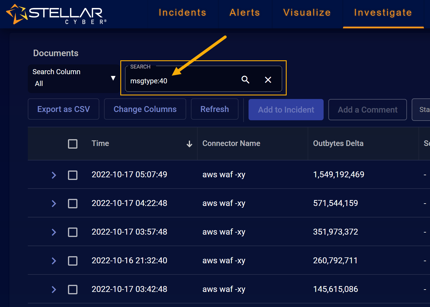 Scroll down to the Document table, enter msgtype:40 in the Search field, and press Enter to filter on just this msgtype. This is the msgtype that quantifies ingestion by connector.
