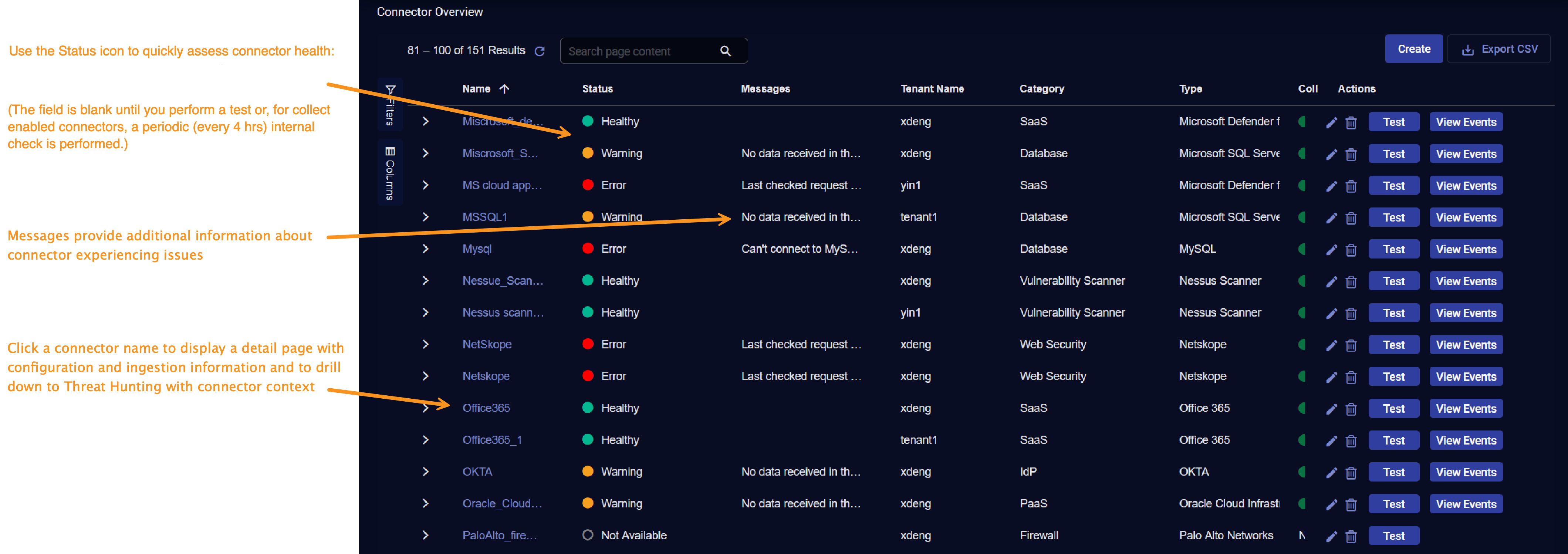 The connector status is displayed in the Connector table in the Status column. There are different colors for different statuses in the user interface. In addition, a message displays when you hover over the Status, for example: No data received in the past 24 hours.