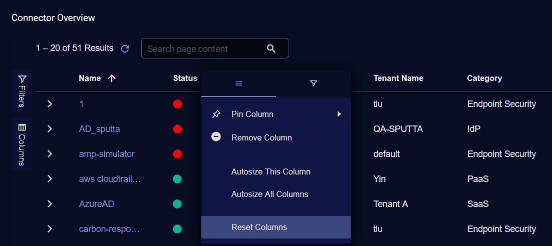 There are several columns in the Connectors table. To see the default columns, click the icon (