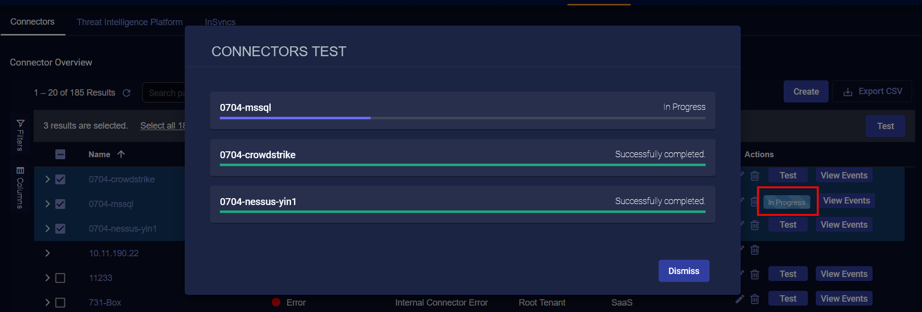 When you have the desired connectors selected, click the Test button in the heading row. The Connectors Test dialog is displayed, which shows the progress of each test. Also note that in the background, any running tests are displayed as In Progress.